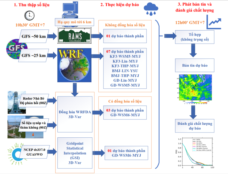 Hình 1. Hệ thống mô hình số trị dự báo định lượng mưa hạn từ 1 đến 3 ngày cho khu vực Nam Bộ được thiết lập ở chế độ hệ thống nghiệp vụ